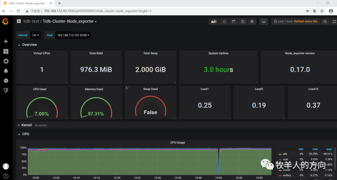 通过http://192.168.112.10:3000/登录 Grafana 监控,默认用户名及密码为 admin/admin。点击 Overview 监控页面检查 TiDB 端口和负载监控信息。