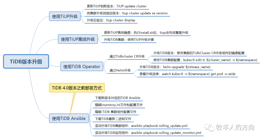 TiDB支持滚动升级,使用TiUP可以在线升级,也可以使用TiUP进行离线升级。如果是基于K8S部署的,也可以使用TiDB Operator进行升级。TiDB 4.0之前的版本则使用TiDB Ansible的方式进行升级。本部分主要介绍使用TiUP进行在线和离线升级。