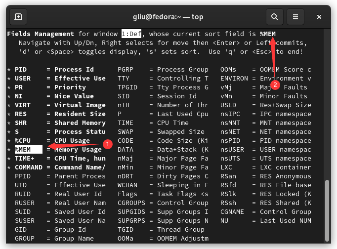 第三步,按下箭头按键来选择不同的参数,如 %MEM, TIME, VIRT 等。选择好后,按 S 键对其进行排序。