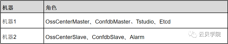 [root@tbase01~ ]# vi tbase_mgr/conf/role.info#eth ip idc_name root password role( OssCenterMaster OssCenterSlaveOssAgent Confdb Alarm TStudio Zookeeper)#Notice: The machine that will be installed OssCenterMaster orOssCenterSlave can't be installed OssAgentens33 192.168.43.129 idc_1 root oracleOssCenterMaster|Confdb|TStudio|Etcdens33 192.168.43.130 idc_1 root oracle OssCenterSlave|Confdb|Alarm#Etcd组件是confdb倒换和center倒换的容灾组件,Etcd部署个数必须是奇数个#Etcd建议跟center或者confdb部署在一起,OssCenter支持一主多备。如果机器数量有足够多,除部署以上所示组件的两台机器,其他机器可以只部署OssAgent即可#(建议最少部署3个Etcd组件,可靠性更高)。