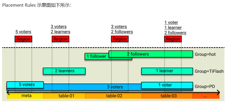 整个规则系统的配置由多条规则即 Rule 组成。每条 Rule 可以指定不同的副本数量、Raft 角色、放置位置等属性,以及这条规则生效的 key range。PD 在进行调度时,会先根据 Region 的 key range 在规则系统中查到该 Region 对应的规则,然后再生成对应的调度,来使得 Region 副本的分布情况符合 Rule。
