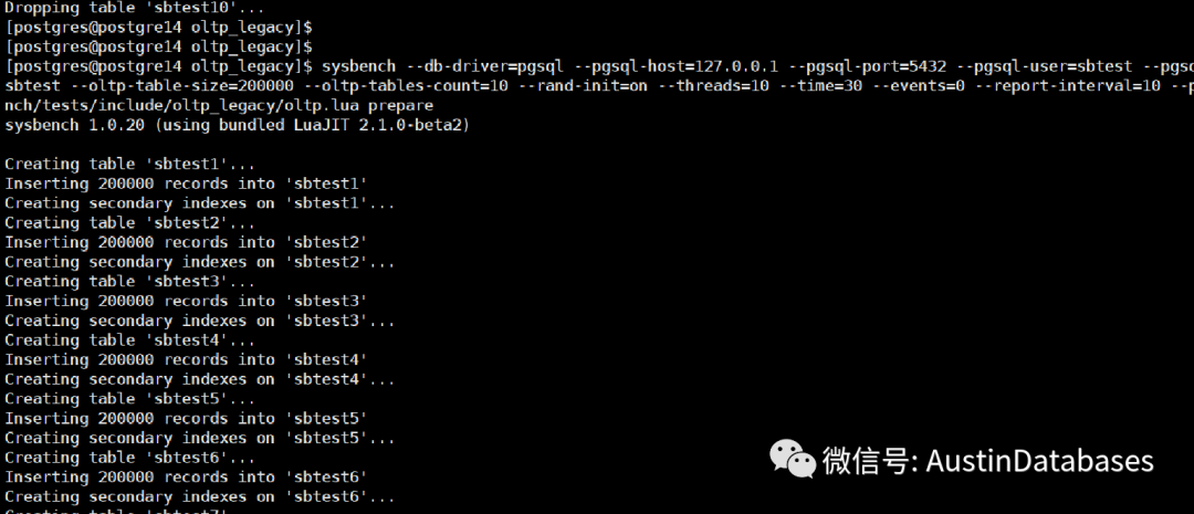 sysbench --db-driver=pgsql --pgsql-host=127.0.0.1 --pgsql-port=5432 --pgsql-user=sbtest --pgsql-password=sbtest --pgsql-db=sbtest --oltp-table-size=200000 --oltp-tables-count=10 --rand-init=on --threads=10 --time=30 --events=0 --report-interval=10 --percentile=99 /usr/share/sysbench/tests/include/oltp_legacy/oltp.lua prepare