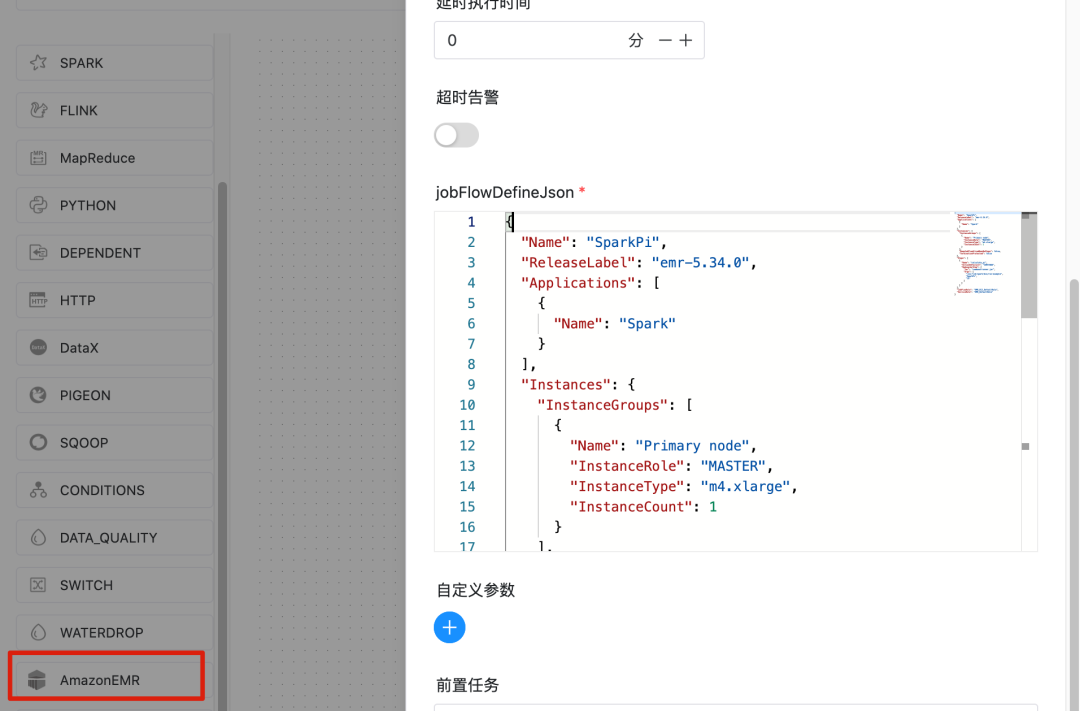 针对 Amazon EMR,我们创建了一个新的任务类型,并提供了其 Run Job Flow 的功能,允许用户向 Amazon EMR 提交多个 steps 作业,并指定使用的资源数量。