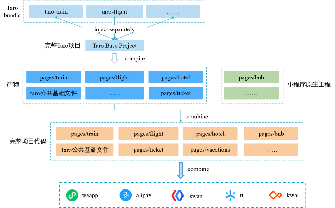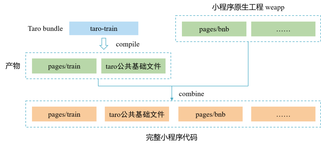 然后,将Taro项目作为完整小程序的一个bundle,将Taro项目的编译产物与小程序原生壳项目进行合并,即可获取到Taro混合开发的完整小程序代码。