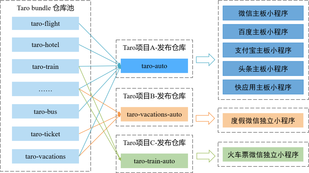 再次,由于gitsubmodule允许一个仓库作为多个仓库的子目录,这意味着可以选取不同的Taro模块,将他们的仓库组合成新的发布仓库,结合携程小程序管理平台中各个小程序所需Taro模块的配置一起使用,可实现根据配置动态引入Taro模块的效果。