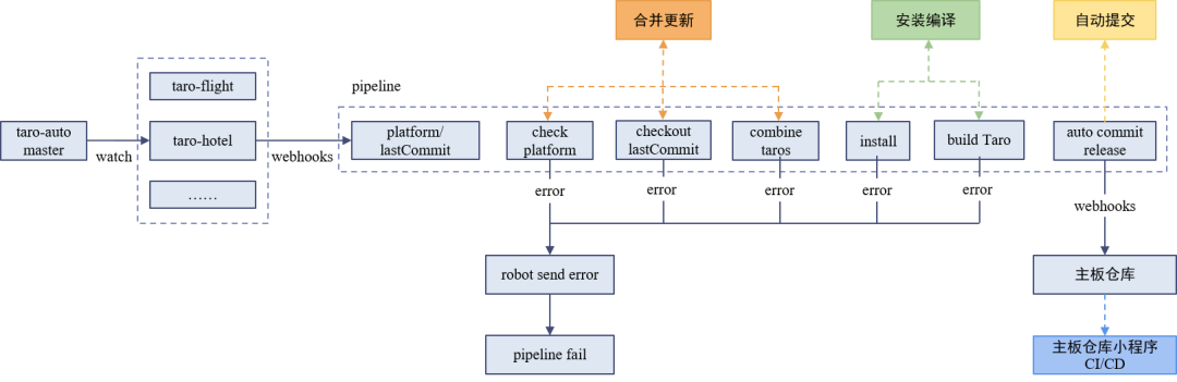 我们利用webhooks 实现Taro项目的流水线式迭代开发,当Taro模块提交修改时,会触发Taro项目发布仓库的pipeline。Taro项目发布仓库pipeline的主要工作流程如下:
