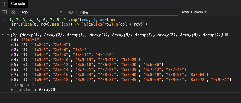 arr.slice(0, row).map((col) => `${col}x${row}=${col * row}`)