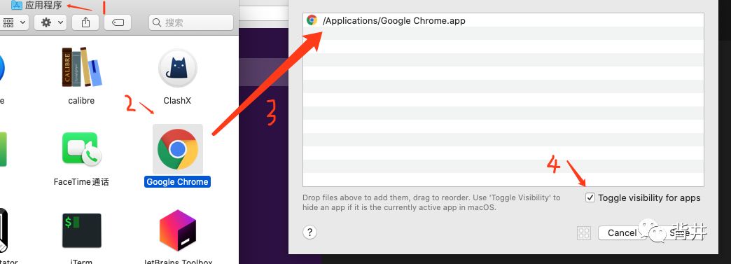打开应用程序文件夹,找到 Google Chrome,并拖到 Alfred 的窗口中,最后勾选右下角 Toggle visibility 按钮。Save。