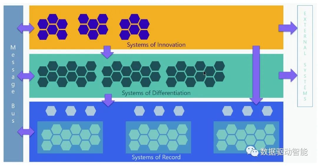 知名咨询公司Gartner在其发布的PaceLayered模型中,依据快速响应业务需求和持续创新的分层思想,将企业系统按照“步速” 分为三个层次:SoR-(Systems of record)、 SoD-(Systems of differentiation)、SoI-(Systems of innovation)。