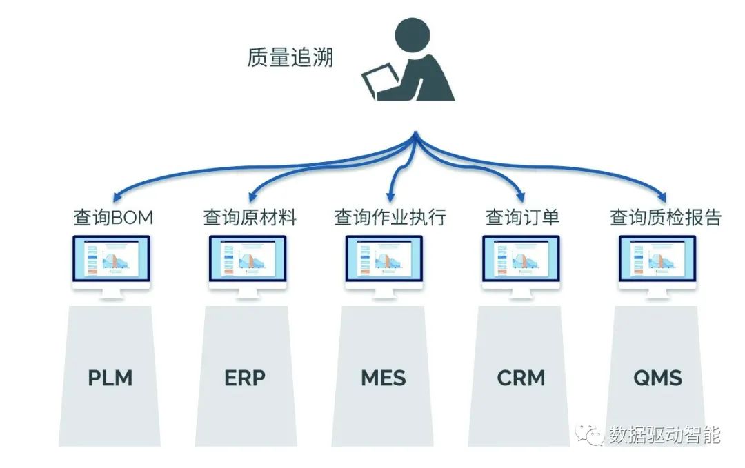信息化是指将企业各种数据(包括产品数据、财务数据、生产数据等)、人力资源和组织架构等以软件化的方式在各种信息系统中进行存储和管理,并通过固化的业务流程在各自系统内实现运转。我们通常所说的PLM、CRM、ERP 和MES等系统就是典型的企业信息化系统,这些系统的共同特点就是为了支撑特定领域的业务应用。