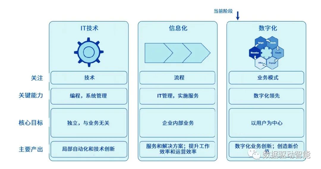 Gartner对企业IT建设划分了三个阶段,即单点信息技术、信息化和数字化。