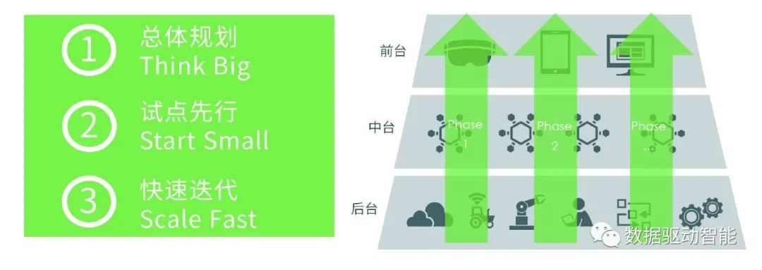 同时,数字中台的建设不是一蹴而就的,在明确总体架构和建设思路的前提下,应以具体应用场景为牵引,重点突破中台建设的关键技术障碍和瓶颈,探索敏捷高效的建设路径;然后再采取“由点到面、快速推广”的策略,扩展到其它业务领域。