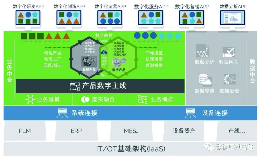 基于前、中、后台的分层架构思想,以中台为核心,重构了工业企业数字化业务体系,贯通了纵向集成(即IT/OT集成)和横向集成(即全寿期价值链集成),实现以数据驱动的创新业务模式。