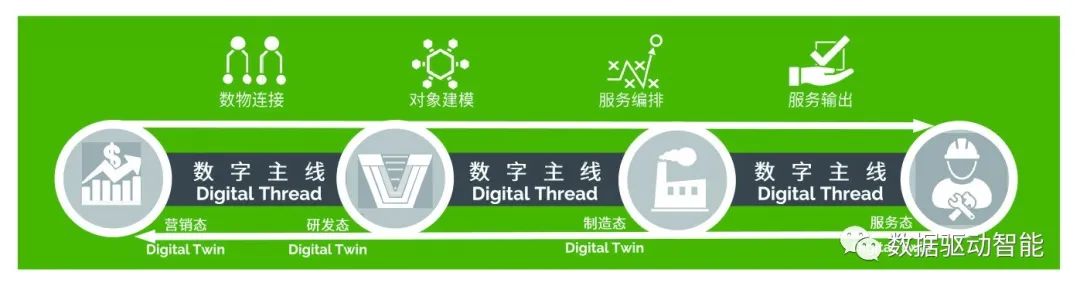 基于数字主线实现数物融合、业务融合。数字主线贯穿了整个产品生命周期,实现从市场营销、到产品设计、生产和运维的无缝衔接,解决了全过程数据流转和追溯问题,是数据驱动业务的基础。数字主线的显著特点是数物融合、业务融合。