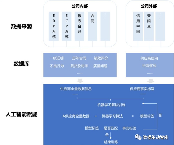3) 业务风险预测:以事实标签为基础,构建事实标签与绩效表现、潜在风险之间的算法模型,比如结合供应商资质业绩、信用、产能等,进行供应商不良行为以及交货及时率的预判。实时更新供应商全量信息库,并不断进行迭代训练,优化完善,持续提高模型的预测精度。