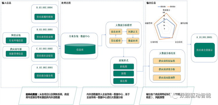 首先,根据设置的模型统计分析供应商全量信息库中的数据,得出供应商履约、供货质量、供货周期等行为表现的事实标签。