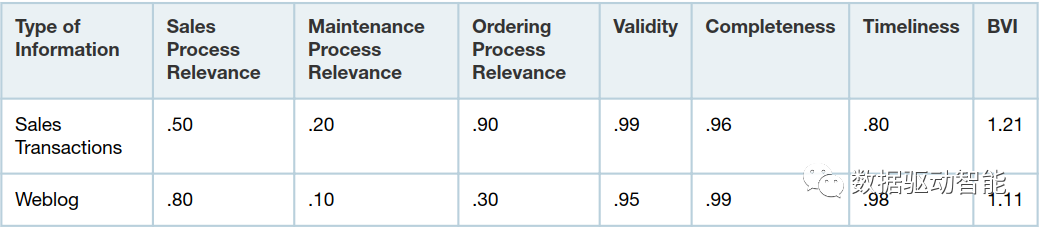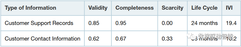 在这个例子中,公司的客户支持数据比客户联系数据具有更大的内在价值。因此,不管具体的业务用途是什么,客户支持数据的使用应该优先于客户联系数据。或者,客户联系系统和流程可能需要更多地关注于改进它们捕获的数据。