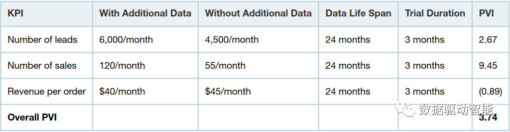 PVI是一个简单的比率,通过合并给定的信息资产来计算KPI改进,在任何给定数据实例的可用生命周期进行推断: