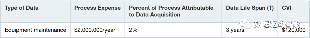 设备维护过程每年花费200万美元,据确定或估计,其中2%用于获取和收集数据。因此,每年捕获价值4万美元的数据,但由于它的使用寿命为3年,我们估计它为12万美元。