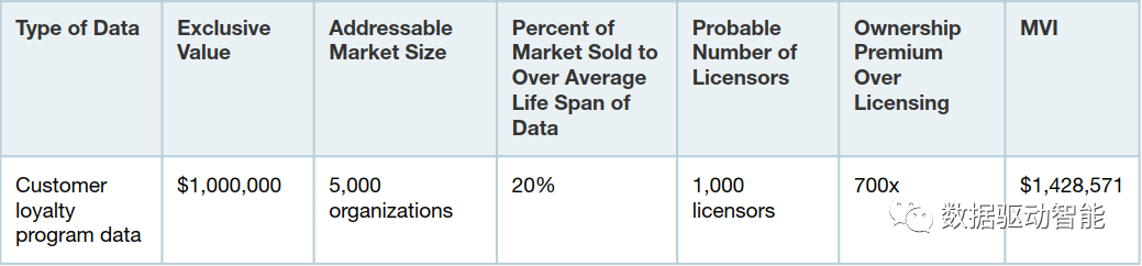 这个例子说明了我们通常所期望的:MVI是信息独占值的小倍数。这是因为潜在的被许可方对数据的普遍可用性的了解几乎抵消了被许可方的数量(特别是,数据所有权溢价的潜在被许可方的数量)。然而,当一个组织的数据成为必要的行业标准信息产品(例如,信用机构、金融数据经纪人、市场研究组织)时,它可以达到指数MVI倍数。