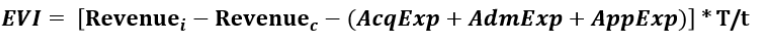 作为上述PVI方法的财务变体,EVI需要进行一段时间的试验。然而,在这种方法中,收入是唯一的KPI,价值是货币而不是比率,并且信息资产的生命周期也被考虑在内。首先,衡量使用这些信息与不使用这些信息产生的收入之间的差异。然后减去信息的生命周期成本。(有关计算生命周期费用的指引,请参考上述CVI模型。)最后,将这个总和乘以信息资产寿命(T)与试验持续时间(t)的比率。在确定EVI时,重要的是在试验期间保持收益过程的所有其他方面不变。