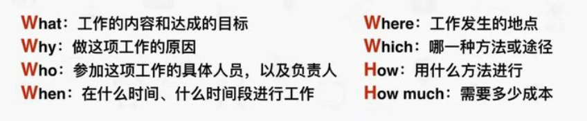 意义:做任何工作都应该从6W2H来思考,这有助于我们的思路的条理化,杜绝盲目性。我们的汇报也应该用6W2H,能节约写报告及看报告的时间。