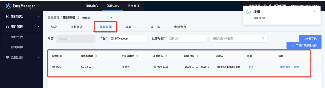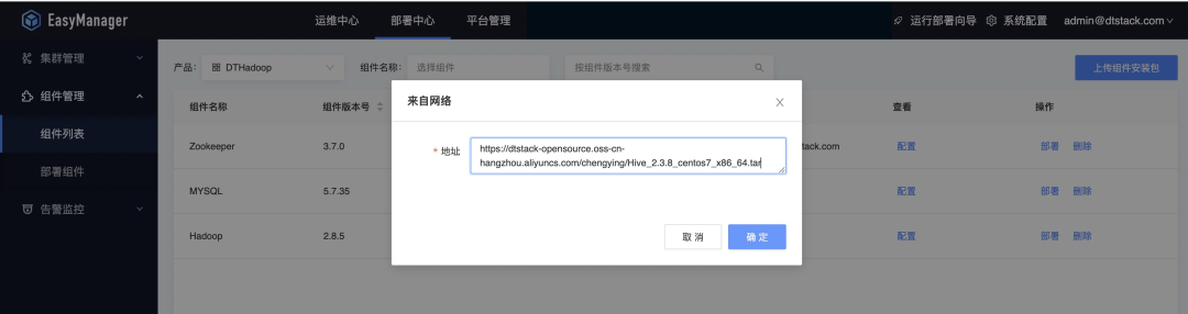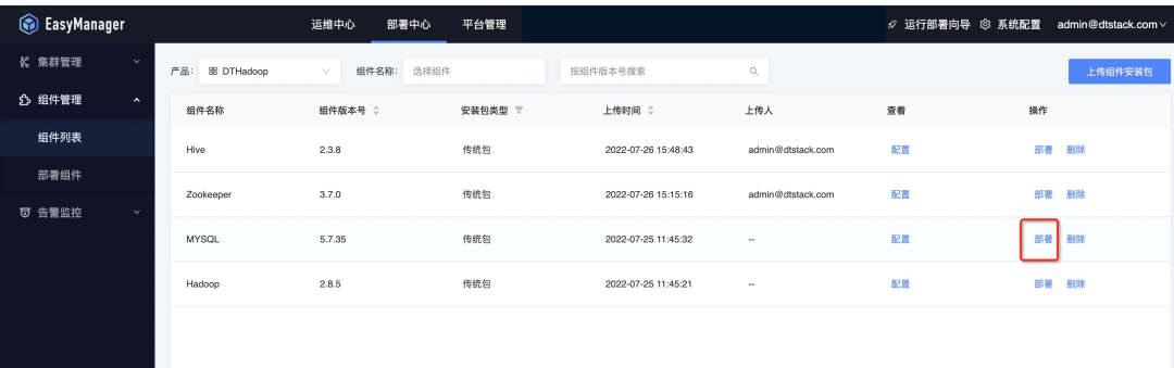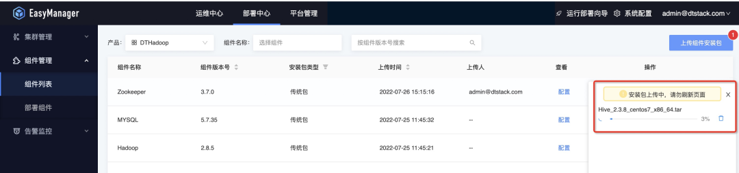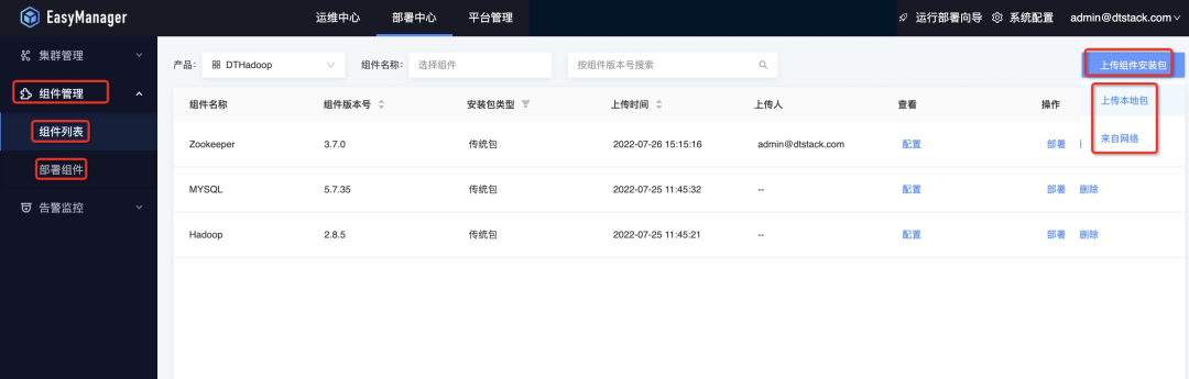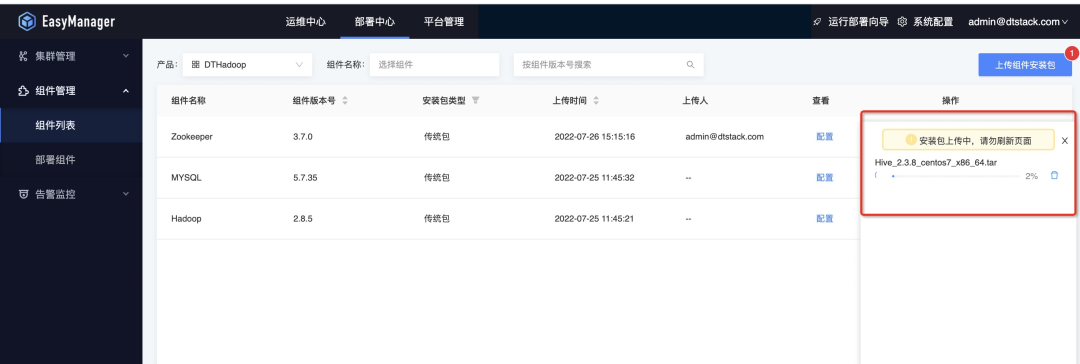 接着我们可以将下载好的产品包直接通过ChengYing界面上传,具体路径是:部署中心—组件管理—组件列表—上传组件安装包: