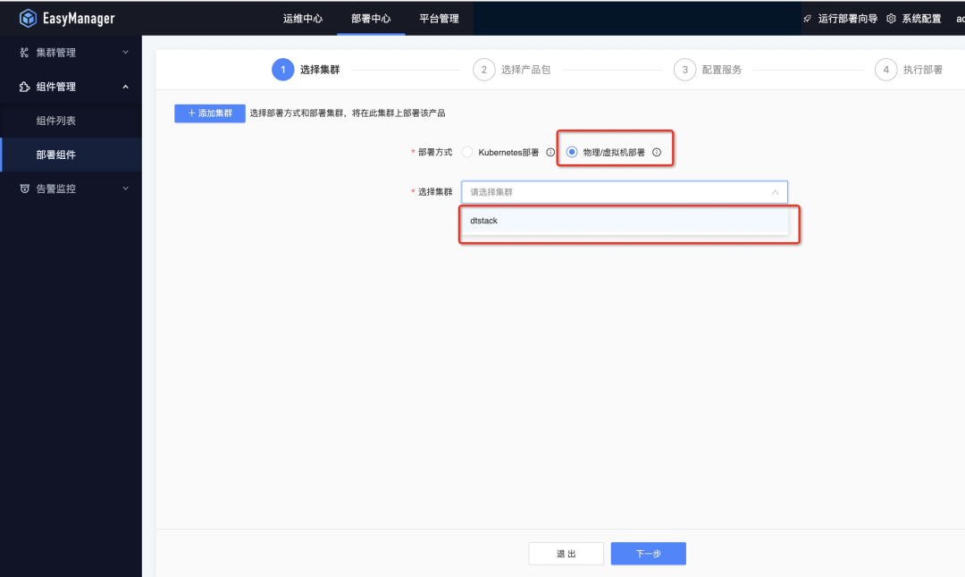 选择需要部署的产品包,点击部署按钮,然后选择对应需要部署的集群,默认集群为dtstack,集群名称可配置;