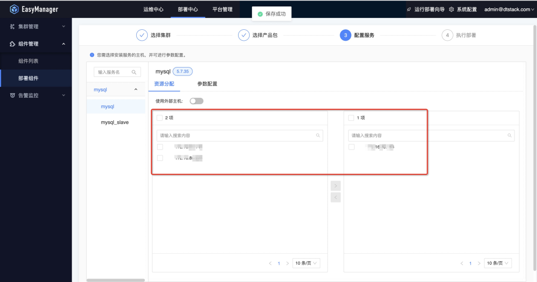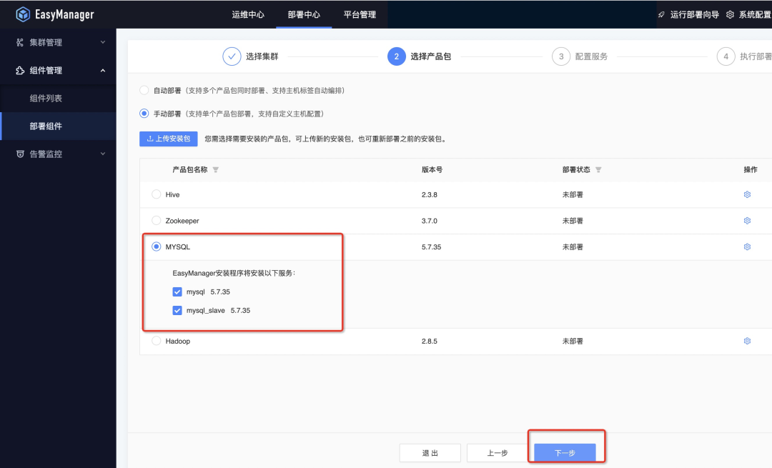 下一步选择需要部署的服务,默认产品包下的服务都会部署,可以根据实际需求部署,在此阶段可以对服务的配置文件进行修改,例如:修改Mysql连接超时时间等;