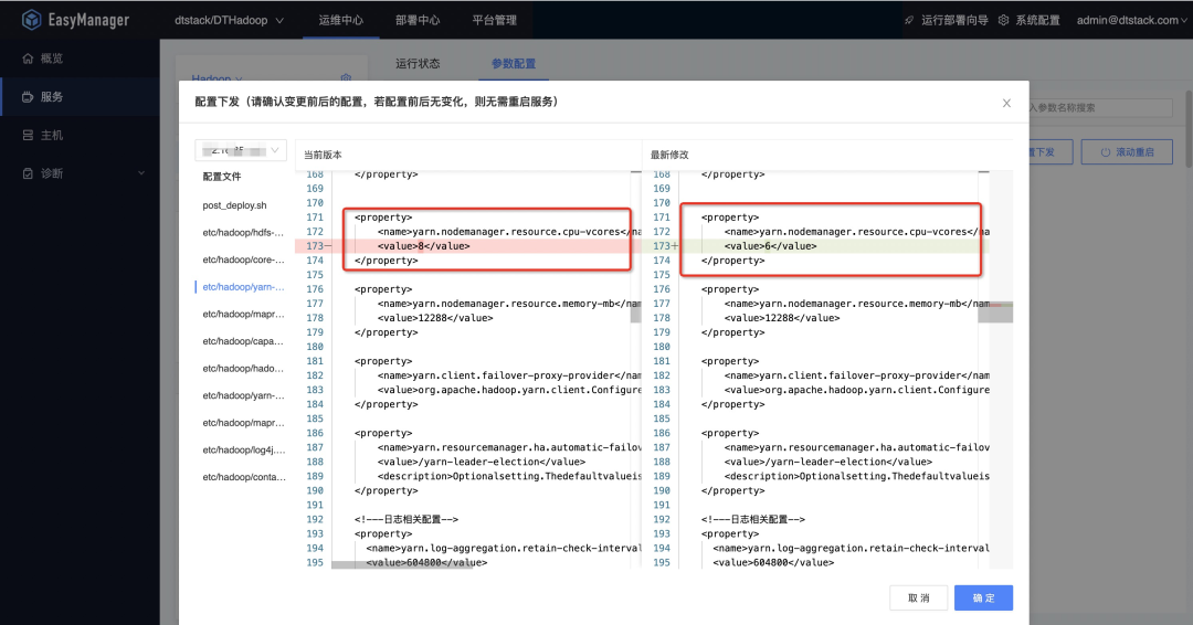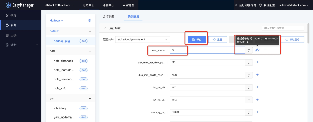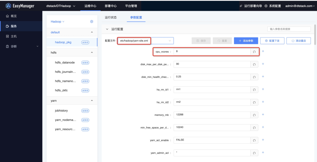例如:如果需要操作修改yarn的配置文件,可以先选择yarn-site.xml文件,可以在搜索框搜索需要修改的配置文件key,如cpu_vcores。