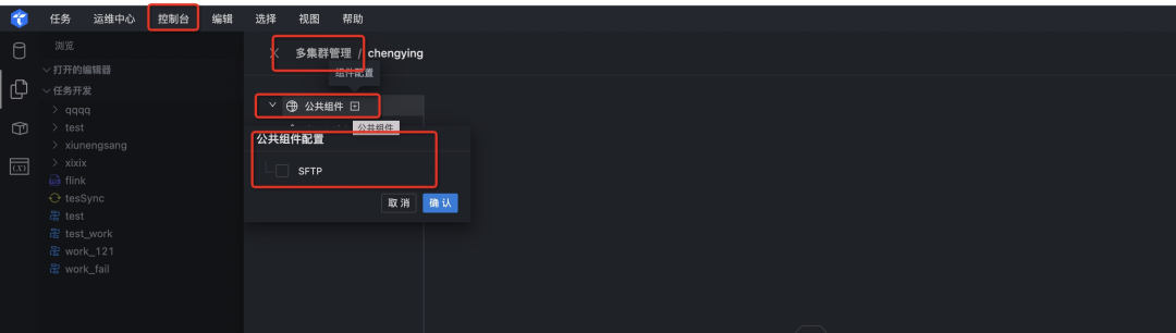 首先进入Taier登陆界面,点击控制台,新增集群,然后进入多集群管理界面,配置公共组件,选择SFTP,进入SFTP配置界面。