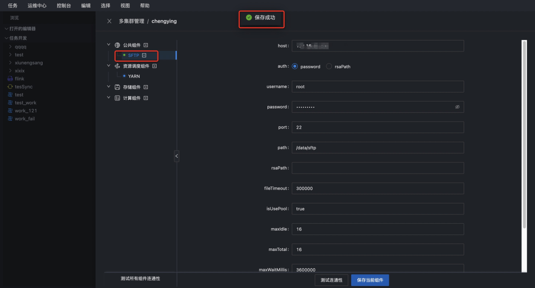 在对接过程中,sftp主机需要和Taier网络相通,并且sftp配置主机的路径需要存在,如果不存在,需要手动创建。
