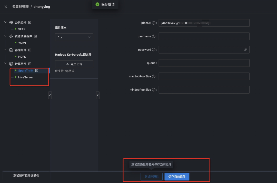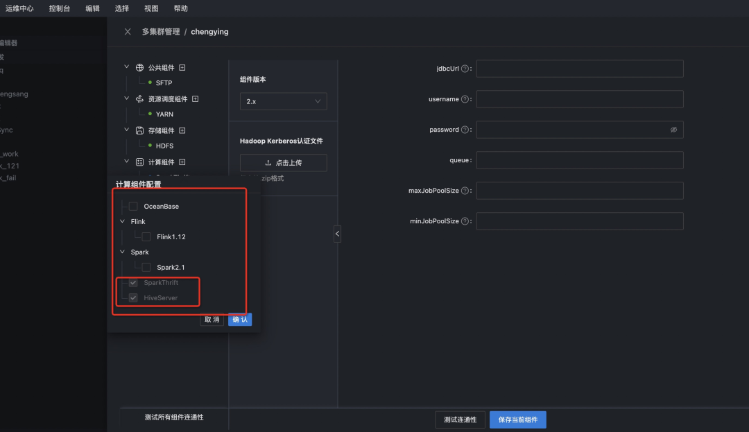 选择计算组件模块,选择需要对接的计算引擎Hive和Spark,选择Hive和Spark的版本,填写对应的jdbc(jdbc:hive://ip:port/)连接串,然后点击保存,测试连通性。