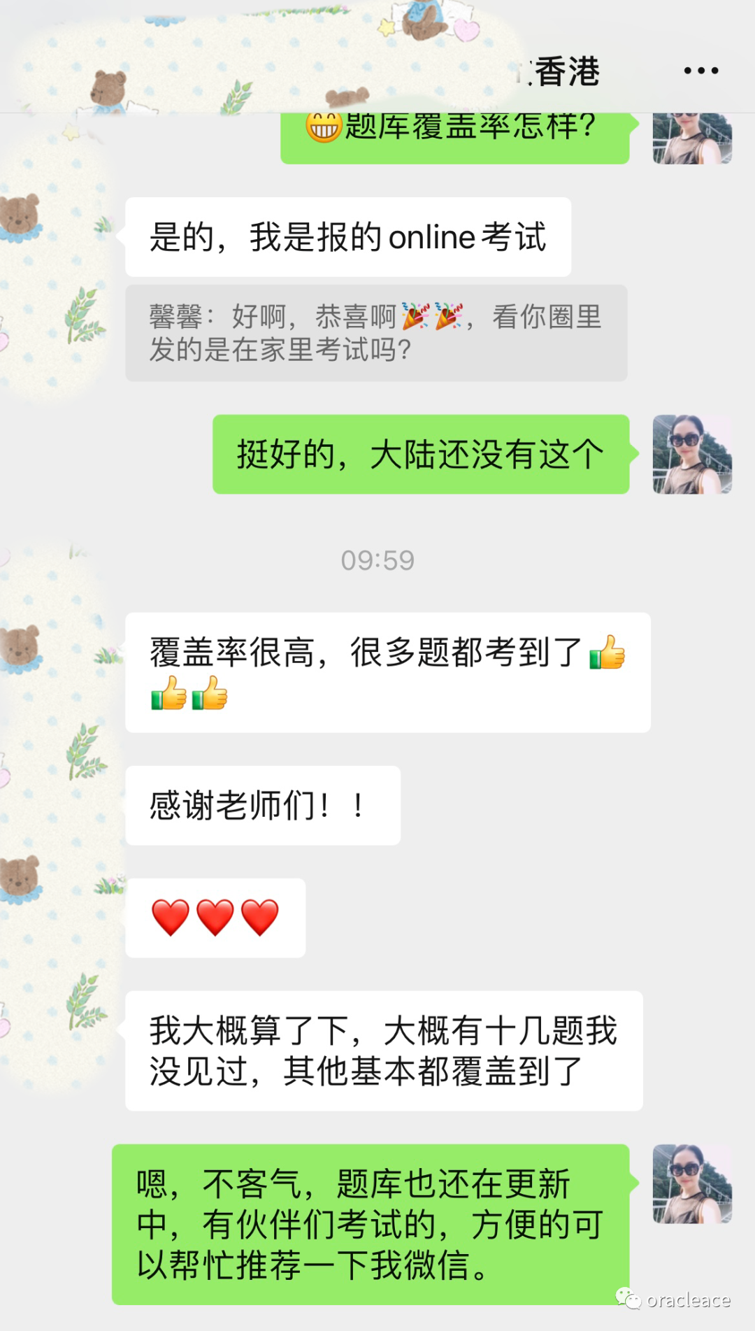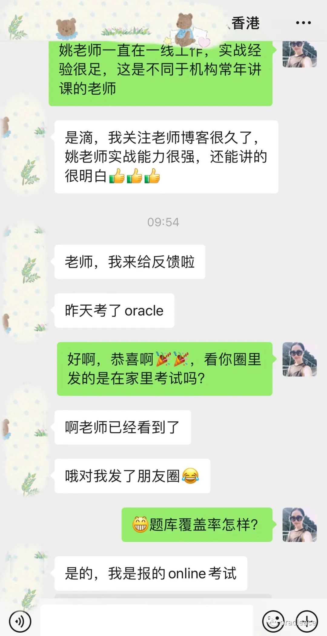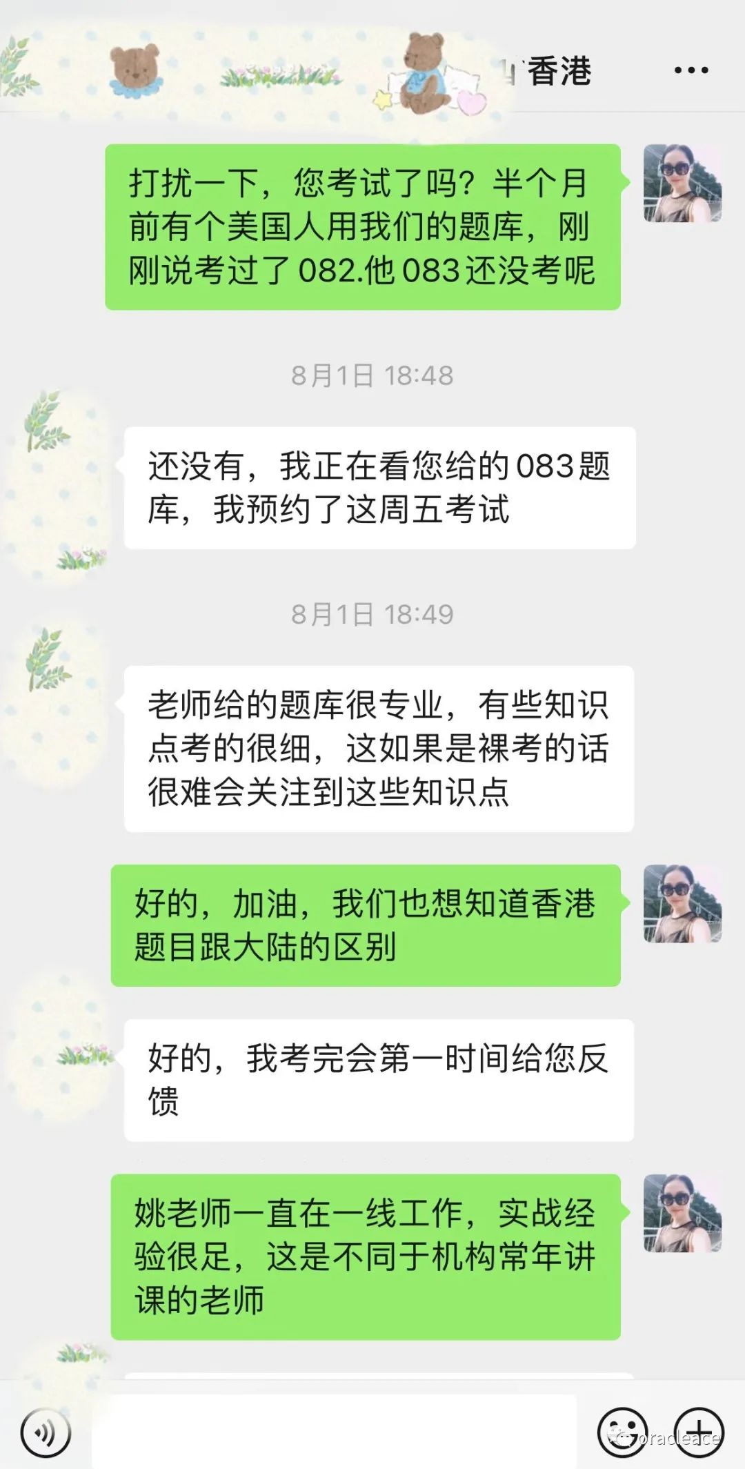 看看姚远老师的学员是怎么考试的,下图是8月初助理老师和学员的聊天记录,姚远老师的一位美国学员刚刚考过了082,很想知道香港出的题目跟我们国内有多的的区别,当时这位香港学员还没考试呢!但学员表示姚老师给的题库解析知识点很细,解析的很专业,可以看出实战能力很强,讲的很明白,并且很久之前就关注了姚老师的博客和公众号。