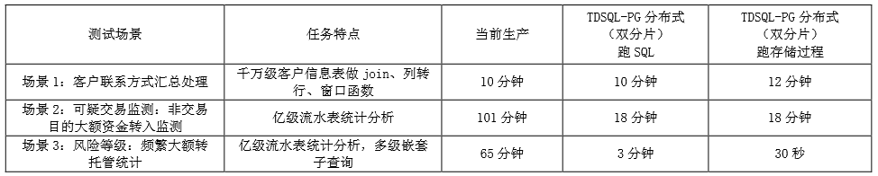如前所述,反洗钱业务兼备了OLTP和OLAP的特征,对此TDSQL PG版的HTAP能力具备独特优势:1、满足OLTP业务场景的高并发需求,同时也能解决计算能力的不足的问题;2、满足OLAP业务场景的计算密集型需求,同时也能解决大数据量下的时延以及吞吐量问题;3、可获得代价、性能、维护成本之间的权衡,同时考虑大批量数据的迁移改造成本。此外TDSQL支持分布式事务、自定义函数、存储过程、窗口函数,分片键改造支持自动指定,等。因此TDSQL PG版具备较为契合的特性来对反洗钱系统进行适配。当前反洗钱系统运行在集中式数据库上,使用传统复制技术部署了一台实时同步的备机。当主库故障的时候,需手工切换至备库,同时应用修改ip地址指向以恢复服务。即一主1备架构,切换为手工操作,高可用切换时效约为分钟级。在反洗钱TDSQL PG版测试环境中,我们部署了3个DN的分布式集群。每个DN即为一个高可用单元,由1主1备共两个副本组成,分别部署在2台服务器上。从副本数量上来说,其高可用能力相比当前集中式架构得到了增强。且得益于TDSQL PG版的分布式架构,反洗钱数据库有了分散集中故障风险的能力。每个DN的主备之间均为自动故障切换,时效为秒级,因此从切换时效上来看,反洗钱数据库的高可用能力也得到了增强。图2 反洗钱系统数据库的TDSQL PG版分布式集群架构反洗钱系统当前的集中式架构仅适用垂直扩容。对于物理机服务器计算能力来说是几乎无法实施扩容的,如CPU、内存。而对于存储容量来说,垂直扩容的量是有上限的,取决于硬件支持能力。我们无法无限制地挂载存储盘到一台服务器上,否则会引发服务器运行稳定方面的问题,并给运维工作带来困难。反洗钱主库为接入了16T容量FC-SAN存储的物理机服务器,备库为VSAN存储物理机服务器。当前主库服务器挂载的存储容量已到达Linux LVM单卷上限,挂载存储盘数量已达18个,继续垂直扩容的价格、维护成本极高。当前存储使用率高达90%,而行业监管要求存放5年历史数据,因此预测其数据量还有40%左右的上涨,当前反洗钱数据库架构已面临严峻的容量考验。反洗钱TDSQL PG版架构具备分布式优势,适用横向扩展。数据以分片的方式存放在了各个DN中。当集群中DN服务器资源平均使用率较高的时候,比如存储容量,我们可以给集群添加一组DN,其中包含2台服务器。也就是说,随着反洗钱业务数据量不断的上涨,总是可以通过给集群添加DN来进行容量扩充。而且操作在线进行,可通过集群自身的平台能力进行自动化管理。不仅存储容量,承载了集群主要计算能力的CN节点也支持横向扩展。当集群计算能力不足时,则添加适当数量的CN节点,即达到扩充计算能力的目的。TDSQL PG版双分片架构在三个场景下优于或不差于现有系统,整体上来看反洗钱TDSQL PG版架构表现良好,能够满足反洗钱业务场景的需求。在测试过程中,我们分别对X86以及ARM平台下的TDSQL PG版反洗钱系统进行了验证,运行稳定,达到预期。使用TDSQL PG版的情况下,反洗钱系统即可脱离集中式数据库的限制,实现完全自主可控,因此满足行业国产化的要求。经过本次探索和实践,我司发现基于TDSQL PG版的反洗钱系统在海量数据下的性能、扩展能力、高可用、灾备、运维、成本节约等方面都有显著提升,TDSQL PG版作为分布式数据库能够为证券业务场景产生应用价值。首先,国外商业数据库已有几十年的发展历程,占据了全球高份额市场,产品能力成熟。相比之下,国产集中式数据库在综合产品能力上还处于起步和发展阶段,需要借助架构来弥补劣势;其次,国产服务器在硬件能力上还略逊色于目前市场主流品牌,因此凸显单体服务器性能瓶颈问题;第三,国产基础设施的可靠性仍需要进一步提升。以上需求导致了我们需要通过分布式架构来解决容量扩展问题,并提升可靠性和冗余度。以上种种,说明了分布式数据库的一个核心特点和价值:架构横向扩展能力。分布式数据库有能力执行单台服务器无法完成的计算、存储任务,借助分布式架构可以提高系统的整体可靠性和吞吐能力。但同时我们也注意到,分布式数据库有擅长的业务场景,也有能力无法覆盖的场景。面对不同的应用与环境,分布式数据库既拥有特定的优势也存在某些劣势。正如不存在完美的架构,单一的数据库架构无法覆盖我司所有的业务场景。从国产分布式数据库的行业应用情况和发展潜力进一步分析,同时结合我司的实践案例和业界同行的使用经验,我们认为国产分布式数据库经历多年的打磨,目前已具备成熟、可持续发展的生态。此外在银行、保险、证券等金融行业有许多成功案例,其中包括银行核心系统案例,其稳定性、可靠性已得到验证,可以满足金融级数据库的要求。然后,具有HTAP代表性的反洗钱系统成功完成基于TDSQL PG版的迁移,证明以TDSQL PG版为代表的国产分布式数据库有能力替代证券系统特定业务类型现有的集中式数据库。其次,分布式架构为我们带来计算、存储横向扩展能力的同时,也不能忽视分布式事务带来的时延问题,在一些低延时场景还需要连同业务角度一起去研究其可行性;此外,产品成熟度也是我们对国产分布式数据库进行选择的重要考量之一,运维工具便利性、附属功能缺失、软件BUG是目前各类国产分布式数据库所面临的普遍问题。最后,我们还要充分理解分布式数据库给我们带来的管理方面