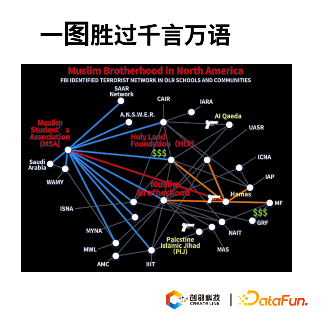 下图为美国穆斯林黑帮组织的图,图中包含相关组织和人员,以及相关的资金和枪支交易,通过该图可以去做恐怖分子挖掘分析。一张图可以将复杂的现实问题展现出来,可谓之:“一图胜过千言万语”。