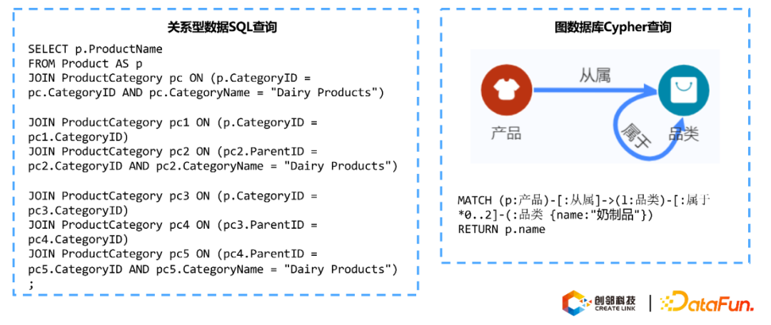 右图展示了产品属于某一个子品类,子品类可能还有母品类的关联关系。在进行查询时,如“所有的奶制品有哪些?”采用图书库的Cypher查询,只需要一句话。而采用关系型的数据SQL查询,涉及到多表的关联查询,较为复杂。