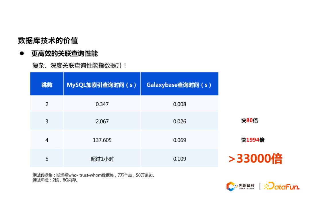 如上图采用具有7万个点,50万条边(小于通常的金融领域使用的图)的数据集,分别采用MySQL加索引查询和图数据库Galaxybase进行查询,对比结果可以看出,图数据库的查询在4跳的时候已经比MySQL的快1994倍,在5跳的时候快几万倍。