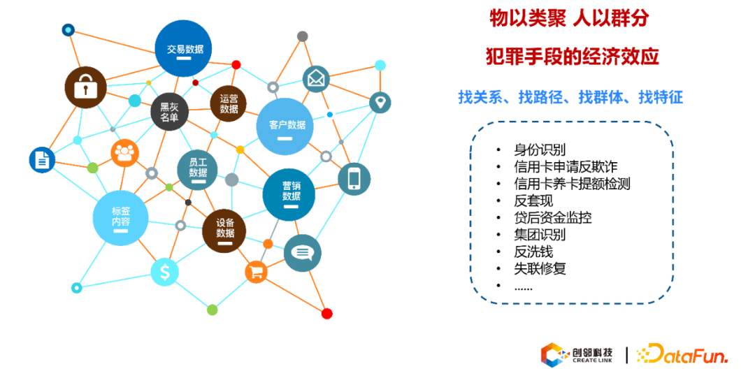 图技术应用与数据分析的底层社会学原理是“物以类聚、人以群分”,该法则同样适用于金融领域。金融机构可以将其所拥有的各类数据,如灰黑名单、交易数据、客户数据、设备数据、标签数据等构建知识图谱,从中找关系、找路径、找群体、找特征,进而辅助业务人员实现业务应用,如身份识别、反洗钱、失联修复等。