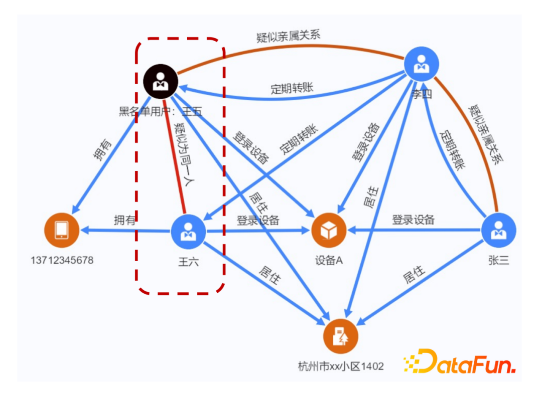 通过使用图计算找共同邻居,分析两点间的相似度,判断数据唯一标识/推理数据关系。例如,通过相同的登录设备、居住地址、定期的转账关系,推理李四与张三和黑名单用户王五为疑似亲属关系,并通过多种相同关系,推理王五与王六为同一人。
