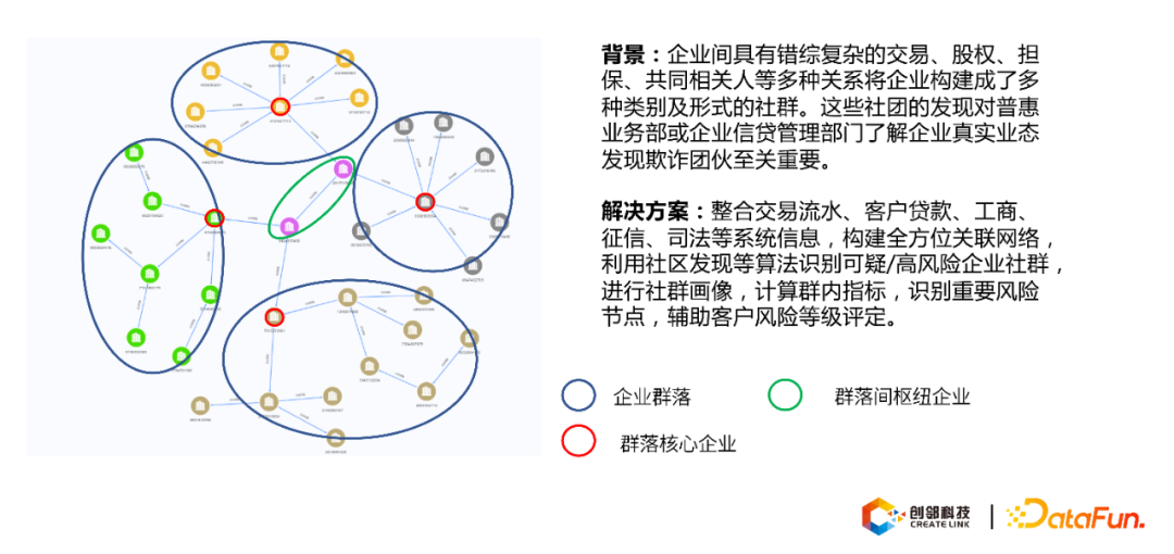企业间具有错综复杂的交易、股权、担保、共同相关人等多种关系将企业构建成了多种类别及形式的社群。这些社团的发现对普惠业务部或企业信贷管理部门了解企业真实业态发现欺诈团伙至关重要。