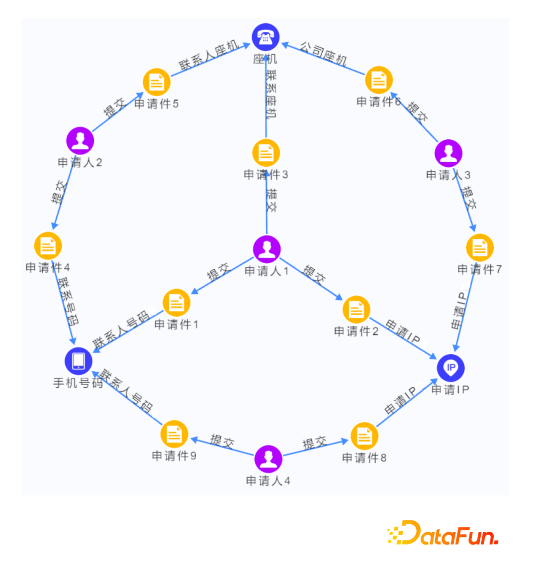 由于犯罪份子追求经济效应,在团伙犯罪时,相同的犯罪资源会重复利用,比如在同一个地点用相同手机不同的身份证申请不同的信用卡,因此可以通过设备ID、IP地址、联系人手机等资源实体出发,由点到面,挖掘识别犯罪团伙。