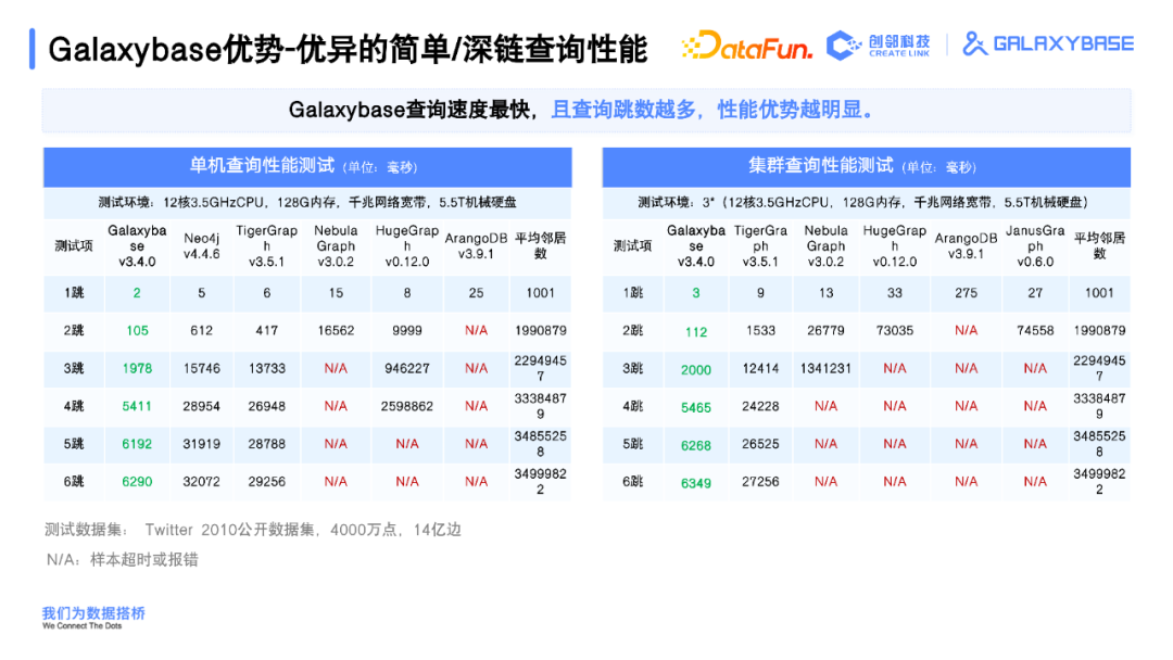 Galaxybase仅使用50台机器集群,实现了5万亿规模大图分布式存储、实时在线查询。创邻科技打破了图数据处理规模的世界纪录(2021年Neo4j使用100台机器完成1.2万亿规模图存储查询),涵盖出入度最大超过1000万的超级节点,六跳深链查询平均耗时仅6.7秒。