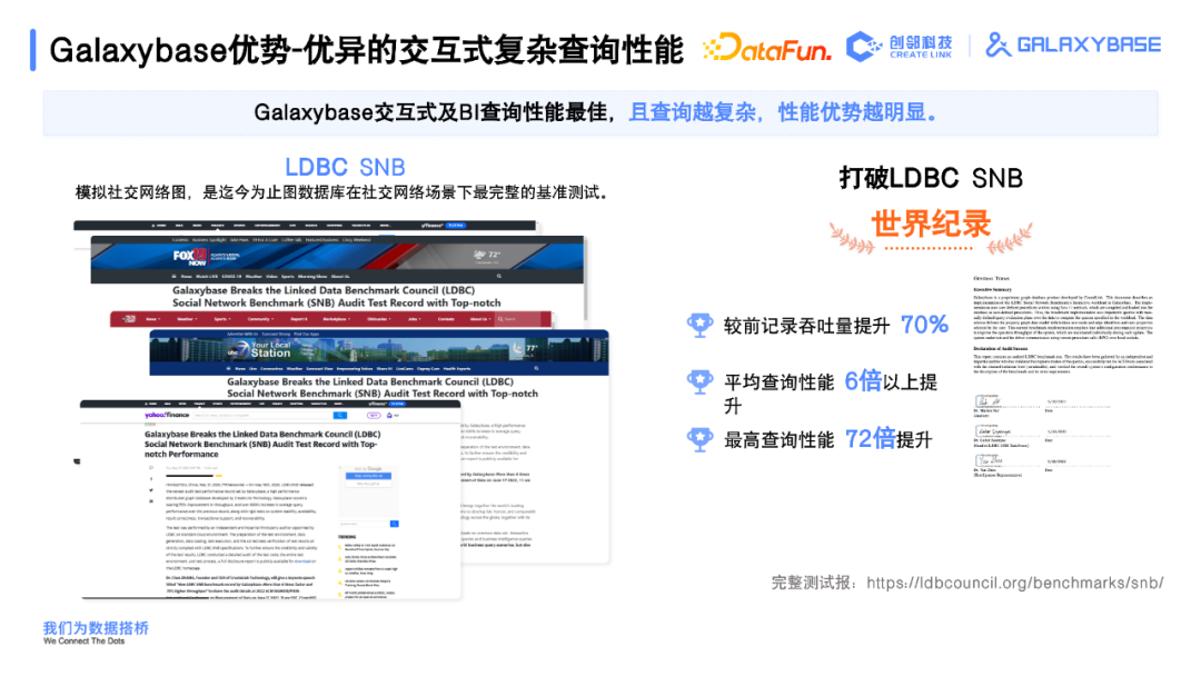 LDBC是迄今为止国际上最完整的图数据库基准测试,能够通过交互式查询与模拟真实业务场景的BI查询更全面的测试数据库的性能。Galaxybase的测试性能全球领先。