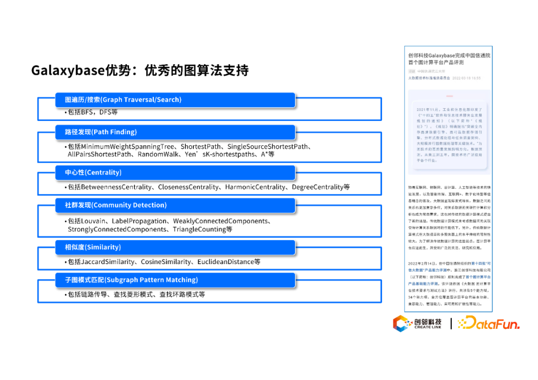 Galaxybase是首个信通院完成测评的图计算平台,涵盖多类图算法,如图遍历、路径发现、社群发现、相似度、中心性和子图模式匹配等。
