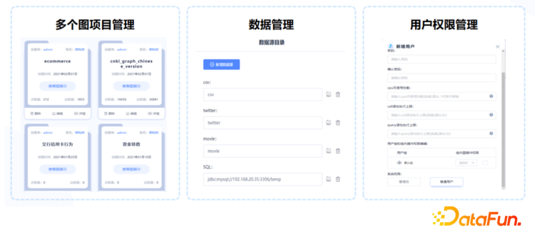 通过可视化视窗对图项目进行创建、搜索、排序、布局,对图数据的格式、名称、来源进行管理;完备的权限管理系统可对不同用户进行细化到属性颗粒度的权限管理。
