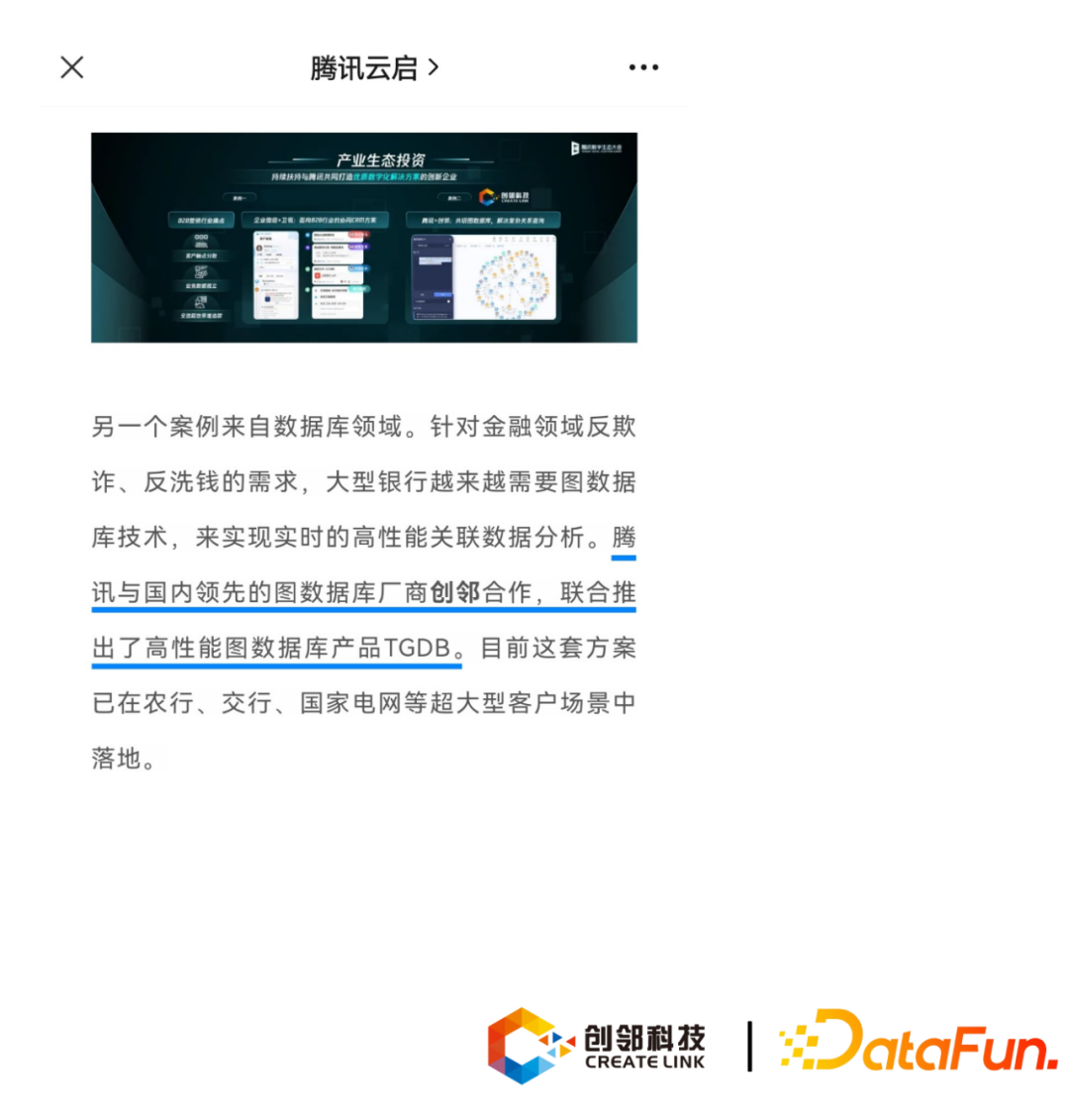 创邻科技加入云启创新生态,与腾讯合作联合推出高性能图数据库产品TGDB,已在农行、交行、国家电网等超大型客户场景中落地,TGDB当前在墨天轮的图数据库类目中排名第一。