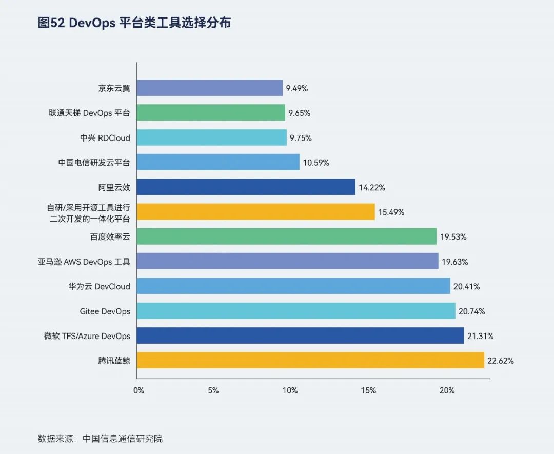 整体DevOps工具市场在2022年呈现繁荣发展、百花齐放,各类商用一体化DevOps平台纷纷上榜,成为企业打造DevOps工艺的新宠儿,其中“腾讯蓝鲸”更是以22.62%的选择率位居第一。