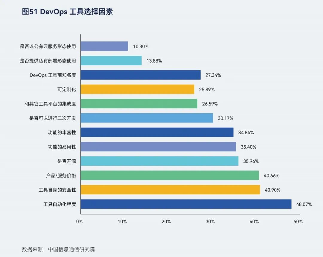 与往年重点关注产品本身的功能易用性、工具安全性和自动化程度不同,“产品/服务价格”首次进入企业DevOps工具选择因素,并位列前三。