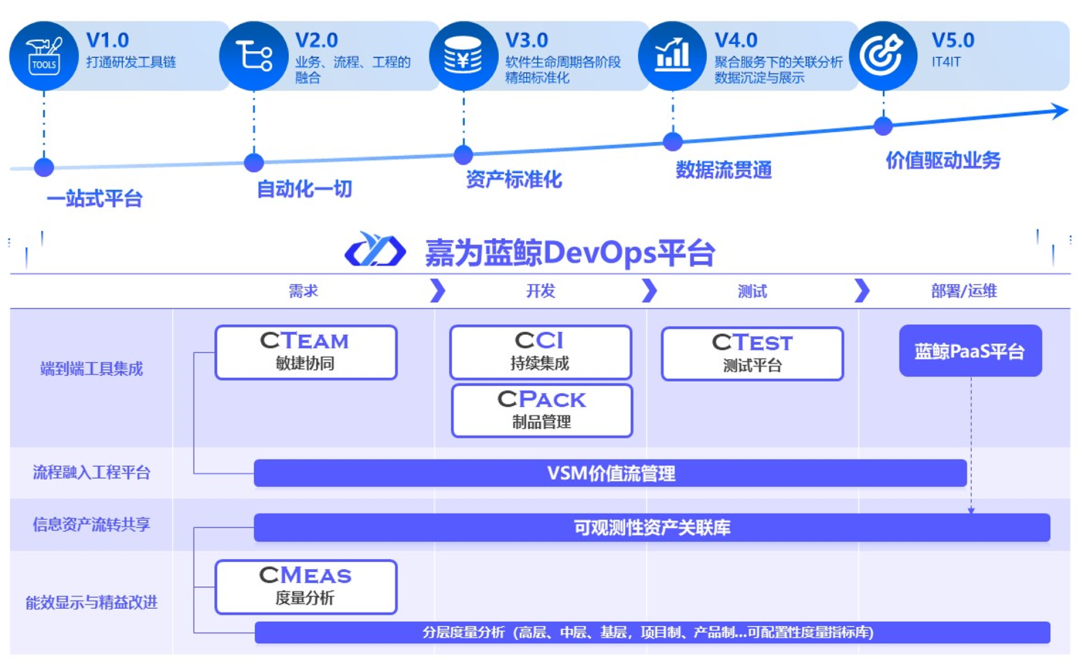 根据嘉为蓝鲸四纵四横DevOp建设理论,企业需要完整打造DevOps能力体系,横向上需要打通“需求-开发-测试-运维”四端,纵向上需要实现“端到端工具集成-流程融入工程平台-信息资产流转共享-能效显示与精益改进”,才能保障企业级数字业务的持续交付和高效交付。